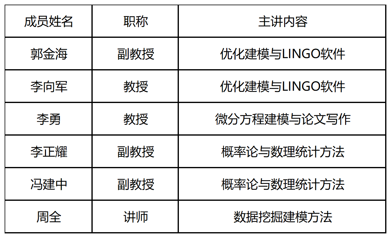 我校数学建模指导教师团队由6名核心教师组成,专业结构合理,经验丰富。团队致力于以赛促学、以赛促教,主要采用“线上线下同步、双校区联动”的教学模式,系统开展数学建模方法、软件应用与论文写作培训,并在暑期组织强化集训,全面提升学生的创新能力和实战水平,带领学生在国内外竞赛中取得优异成绩。