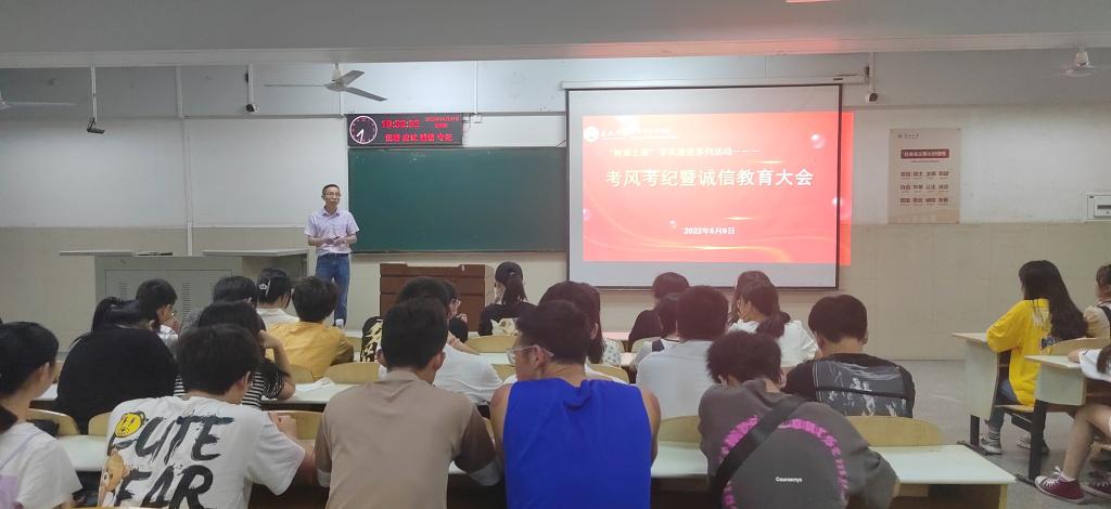 为进一步加强学风建设,端正考风、严肃考纪,6月9日,我院在12教104教室召开考风考纪暨诚信教育大会。院党委副书记袁海山主讲,我院报名参加2022年上半年大学英语四六级考试的考生参加会议。