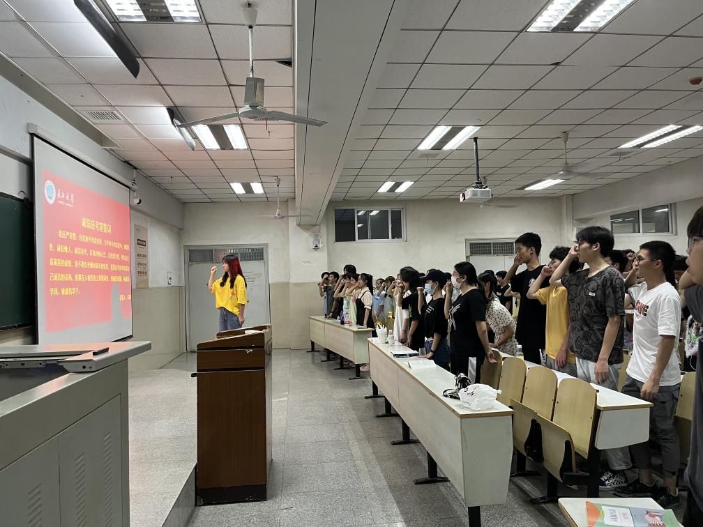 袁海山还带领大家一起学习了我校资助政策体系。最后,袁海山带领大家进行诚信应考宣誓并预祝全体考生在在考试中取得好的成绩。