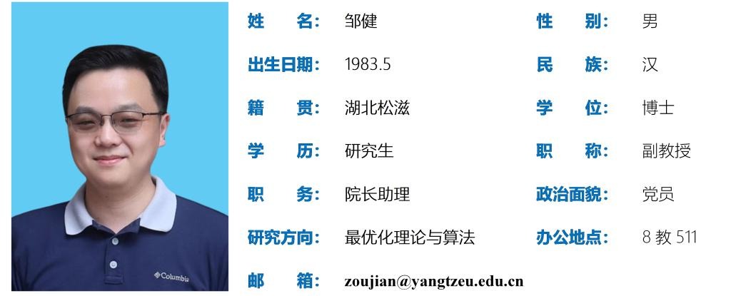 邹健,男,1983年5月出生,博士研究生,副教授。主要研究方向为最优化理论与算法、图像处理;主持完成国家自然科学基金1项;发表学术论文30余篇,其中被SCI检索20余篇;获得英国上市公司365教学质量优秀奖,英国上市公司365科研立项贡献奖,英国上市公司365优秀研究生导师,入选首届长江人才计划。