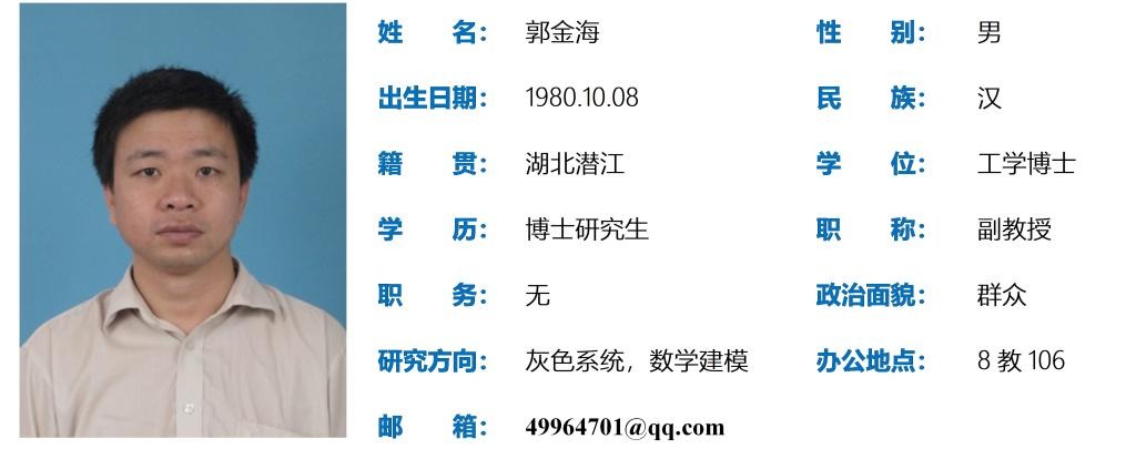 郭金海,男, 1980年10月出生,博士研究生,副教授。2016年12月毕业于武汉理工大学一般力学与力学基础专业,获博士学位,主要研究方向为灰色系统理论及其应用和数学建模。一直从事大学生数学建模和数学竞赛的指导工作,指导学生获多项国家奖和省奖,获得“全国大学生数学建模竞赛湖北省优秀指导教师”。荣获“教学质量优秀奖”和“学生最喜爱的老师”。参与国家自然科学基金项目3项、省部级科研项目2项,共发表学术论文16篇,其中被SCI检索收录5篇,EI收录6篇。